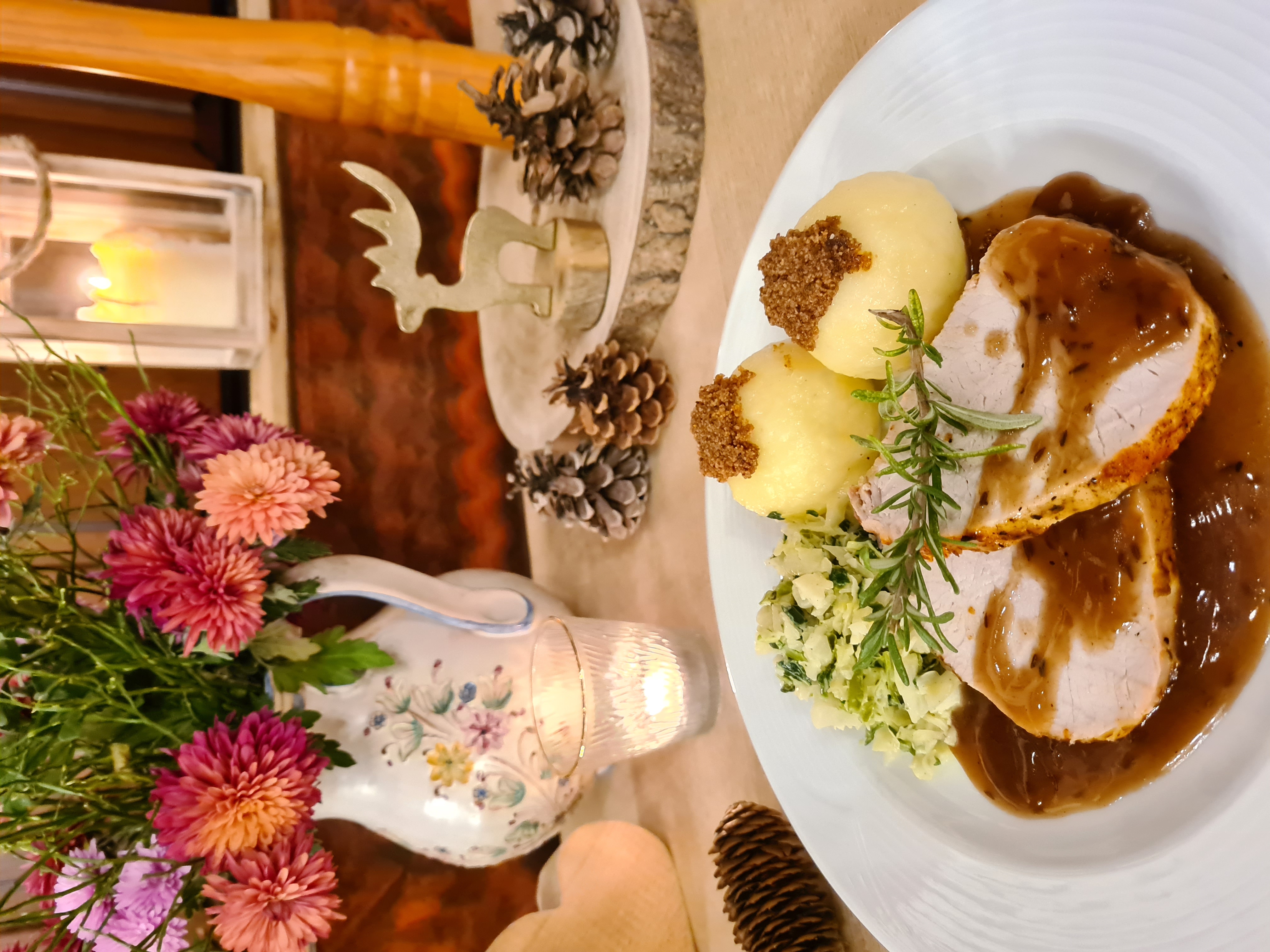 6. Schweinebraten Dunkelbiersoße, Kartoffelknödel, Rahmwirsing und kleinem Gartensalat