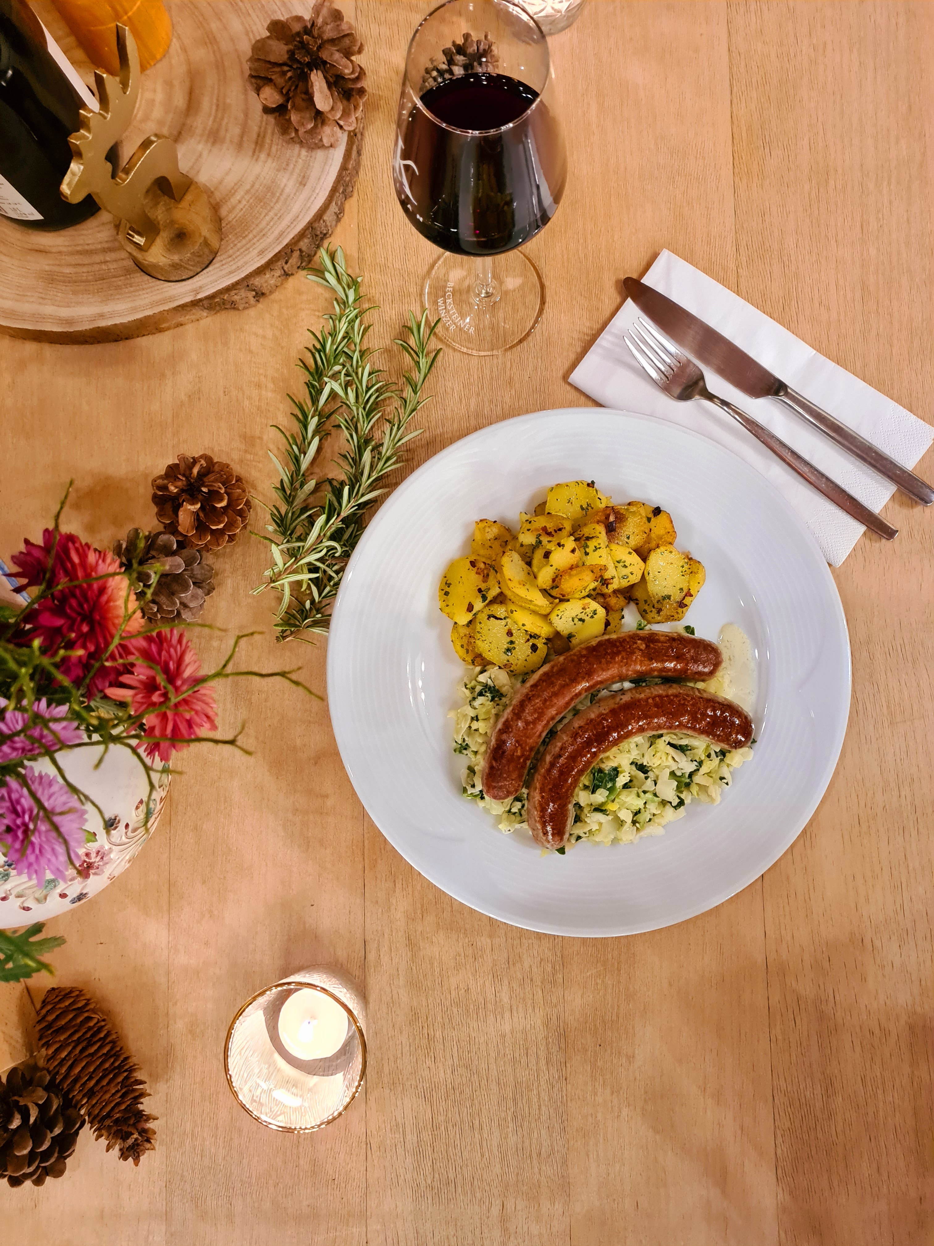 1. Fassbratwürste mit Soße, Silvaner- Rahm- Sauerkraut und Bratkartoffeln